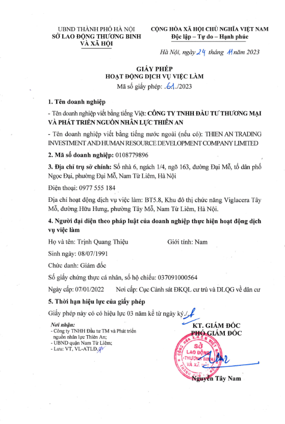 CÔNG TY TNHH ĐẦU TƯ THƯƠNG MẠI VÀ PHÁT TRIỂN NGUỒN NHÂN LỰC THIÊN AN
